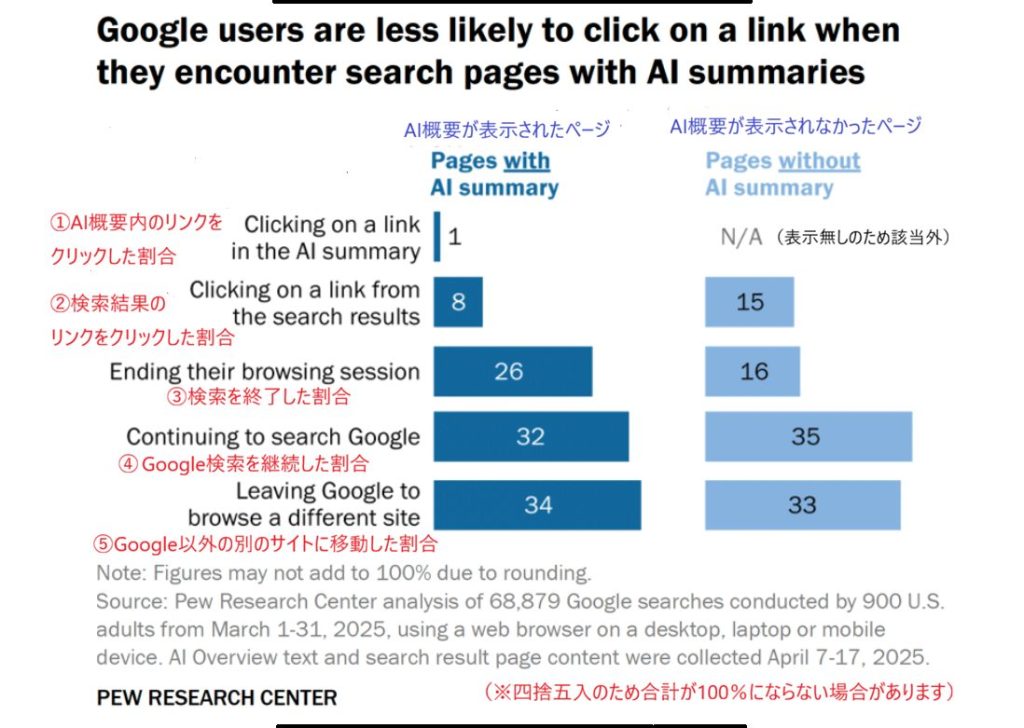 (画像引用:https://www.pewresearch.org/short-reads/2025/07/22/google-users-are-less-likely-to-click-on-links-when-an-ai-summary-appears-in-the-results/)