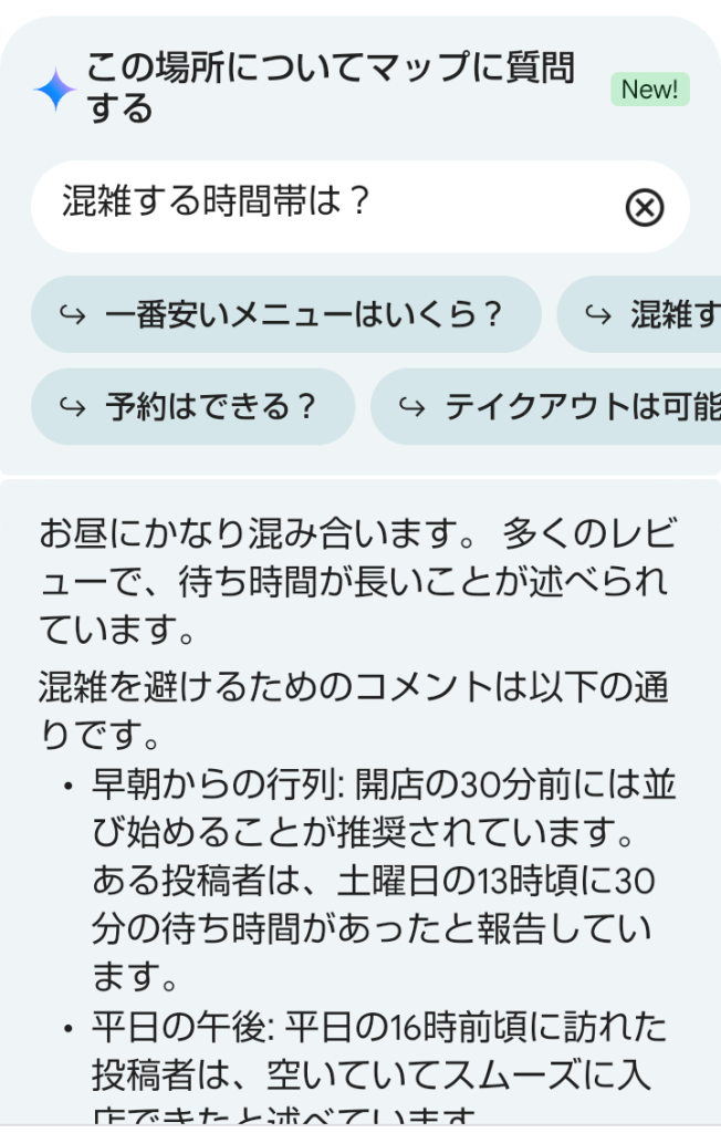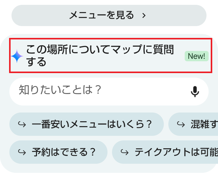 国内でも一部の飲食店等で実装されており、モバイルのマップアプリで検索すると「この場所についてマップで質問する」と表示されます。