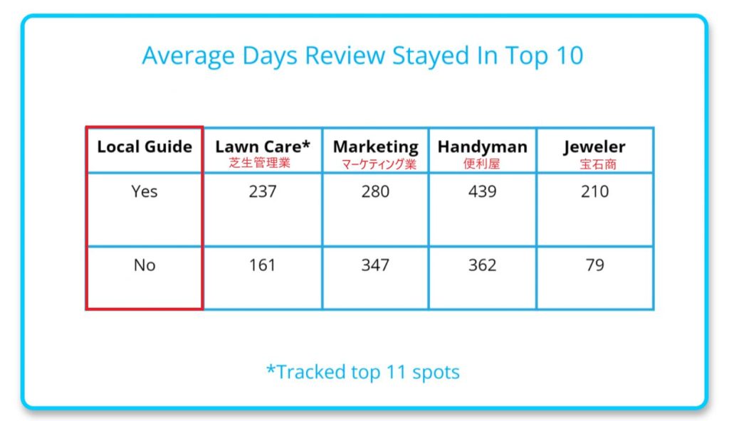特に「宝石商(Jeweler)」のデータが顕著ですが、一般ユーザーは2ヶ月程で上位表示が消えている一方で、ローカルガイドによるレビューは200日以上も上位表示されています。