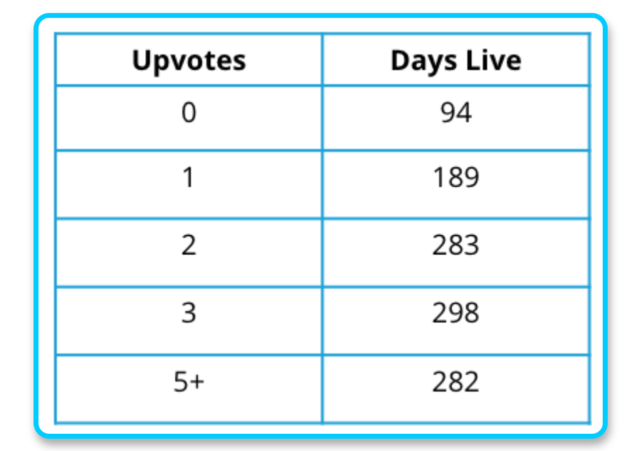 しかし、2つ以上のupvotes(いいね・役に立った)を獲得したレビューは、0または1つのいいねを獲得したレビューよりもトップ10に留まる期間が大幅に長く、平均で約100日長く留まっていることがわかりました。