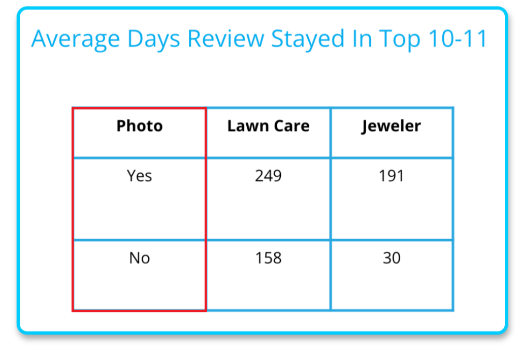 更にSterling Sky社は実験として「数年前にレビューを残したユーザー」に対し、そのレビューに写真を追加してもらうよう促しました。このレビューは2年以上トップ10にも表示されたことがありません。該当レビューの文章は一切変更せず、写真のみをアップロードしてもらいました。