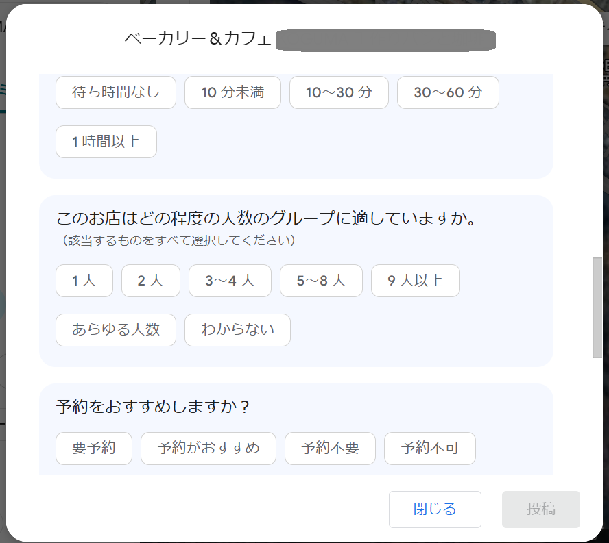 レビューを投稿する際に表示される、サービス内容を選択するタグ(下図参照)の設置有無については、上位表示と関連するような根拠は見つかりませんでした。