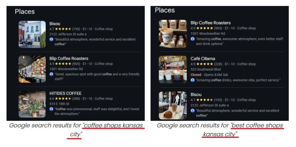 上記のように、同じ場所でも「coffee shops kansas city」と「best coffee shops kansas city」では、検索結果の順序が変わります。他の要素の関連性を考慮しながらも、星評価の高いビジネスは表示される可能性が高まる事が伺えます。